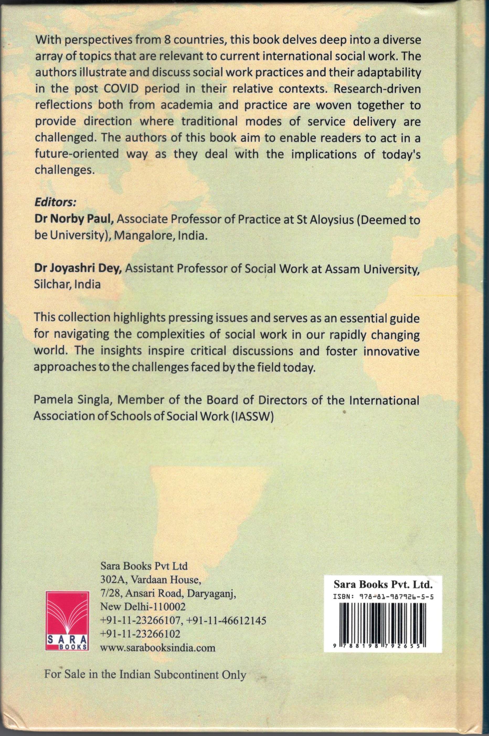This book is the outcome of the relentless and uncompromising commitment of a group of academicians and practitioners to reflect upon and disseminate knowledge of their expertise in social work. We deeply appreciate the immense effort undertaken by the authors to bring out the best in their respective sub- jects especially as the post COVID challenges demanded extra efforts from social workers across the globe in various dimensions and intensities. It is our privilege to have foreword of the book by Dr. Pamela Singla. We extend our sincere gratitude to those who assisted and encouraged us in this endeavour, including our family members, friends, Dr. Kavitha R, research scholars Gitan- jali Sharma, Safiya R., Ancy Abraham, and Sheethal M.J, and all higher au- thorities who supported and promoted us to undertake this noble enterprise. We sincerely thank Budrich Publications for publishing and distributing this book. We dedicate this book to all budding social workers.