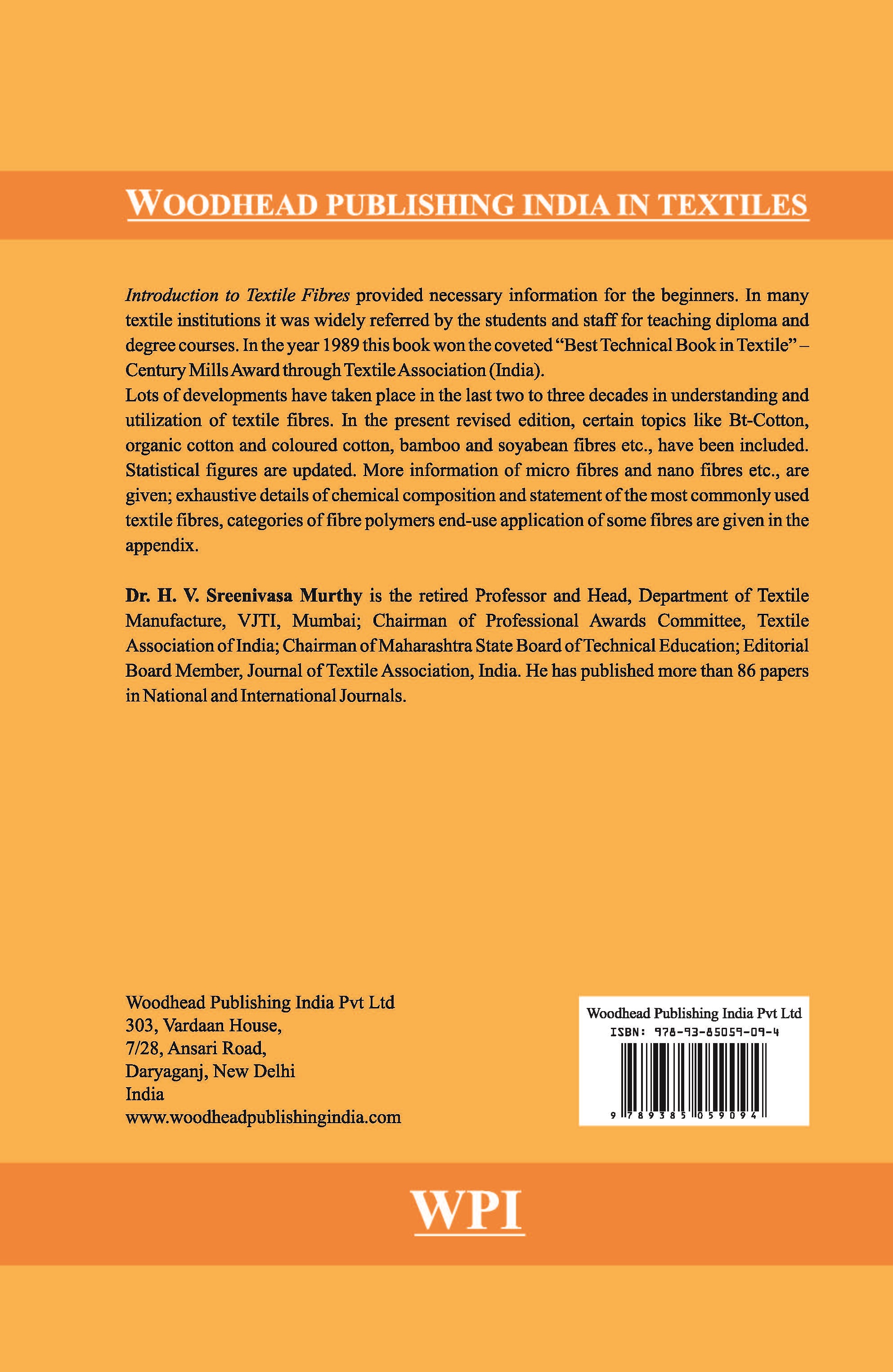 Introduction to Textile Fibres provided necessary information for the beginners. In many textile institutions it was widely referred by the students and staff for teaching diploma and degree courses. In the year 1989 this book won the coveted “Best Technical Book in Textile” – Century Mills Award through Textile Association (India).